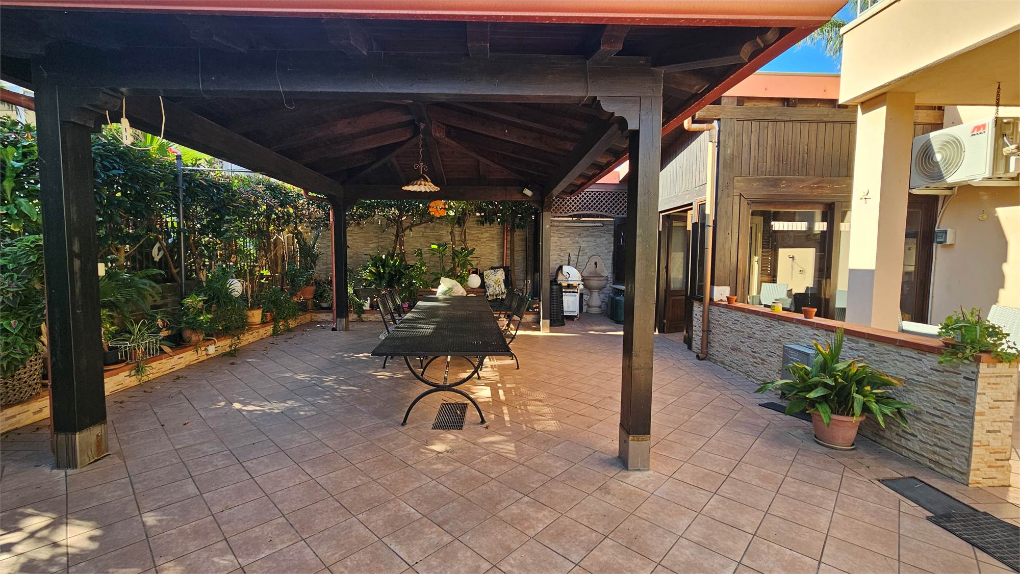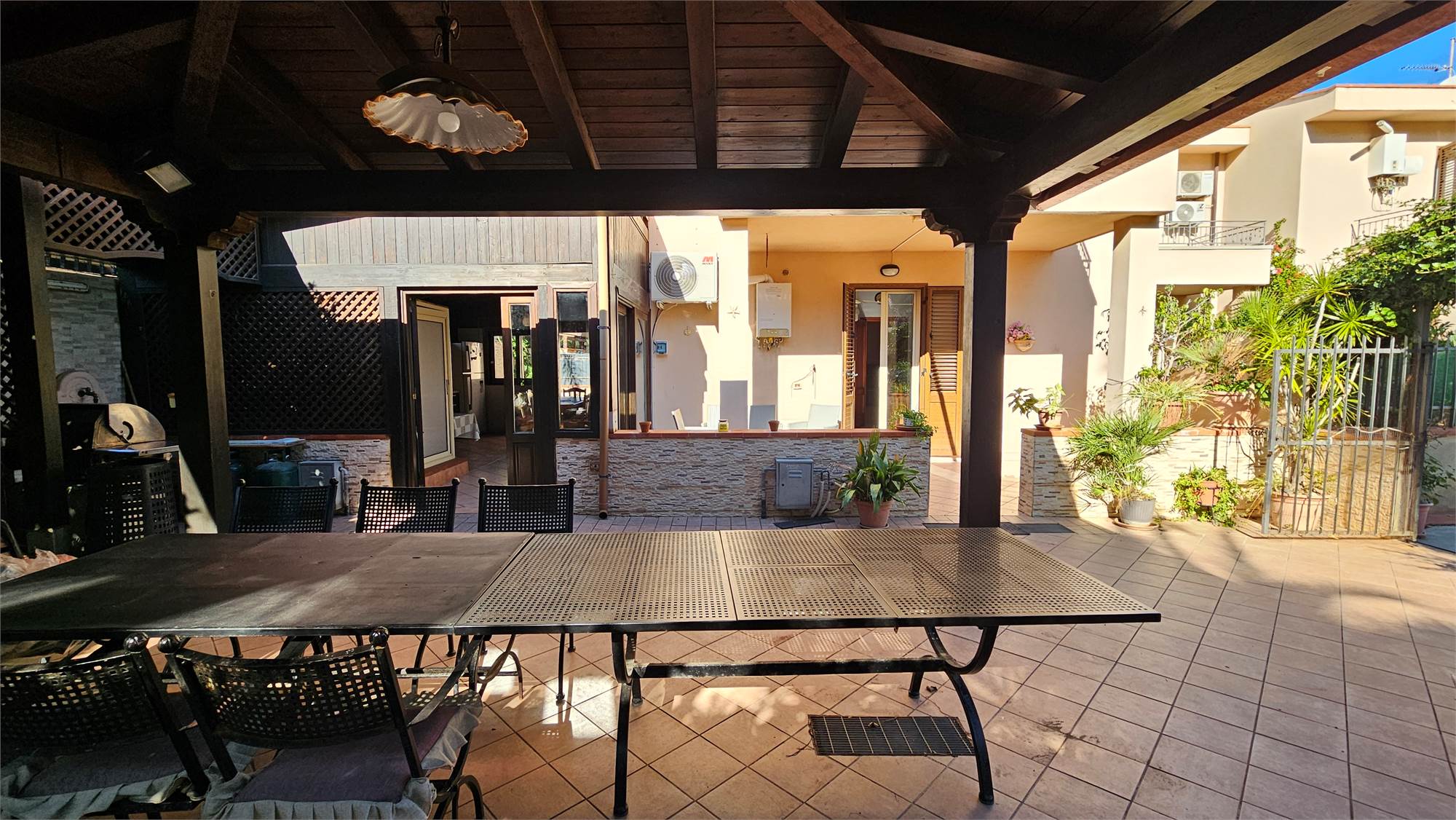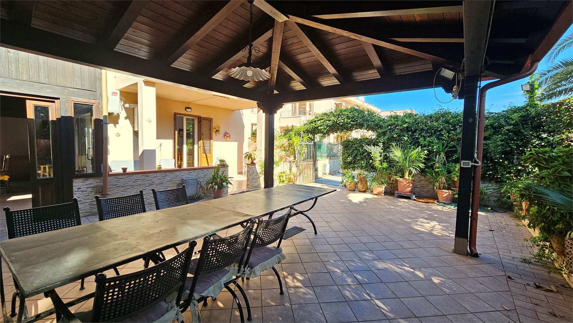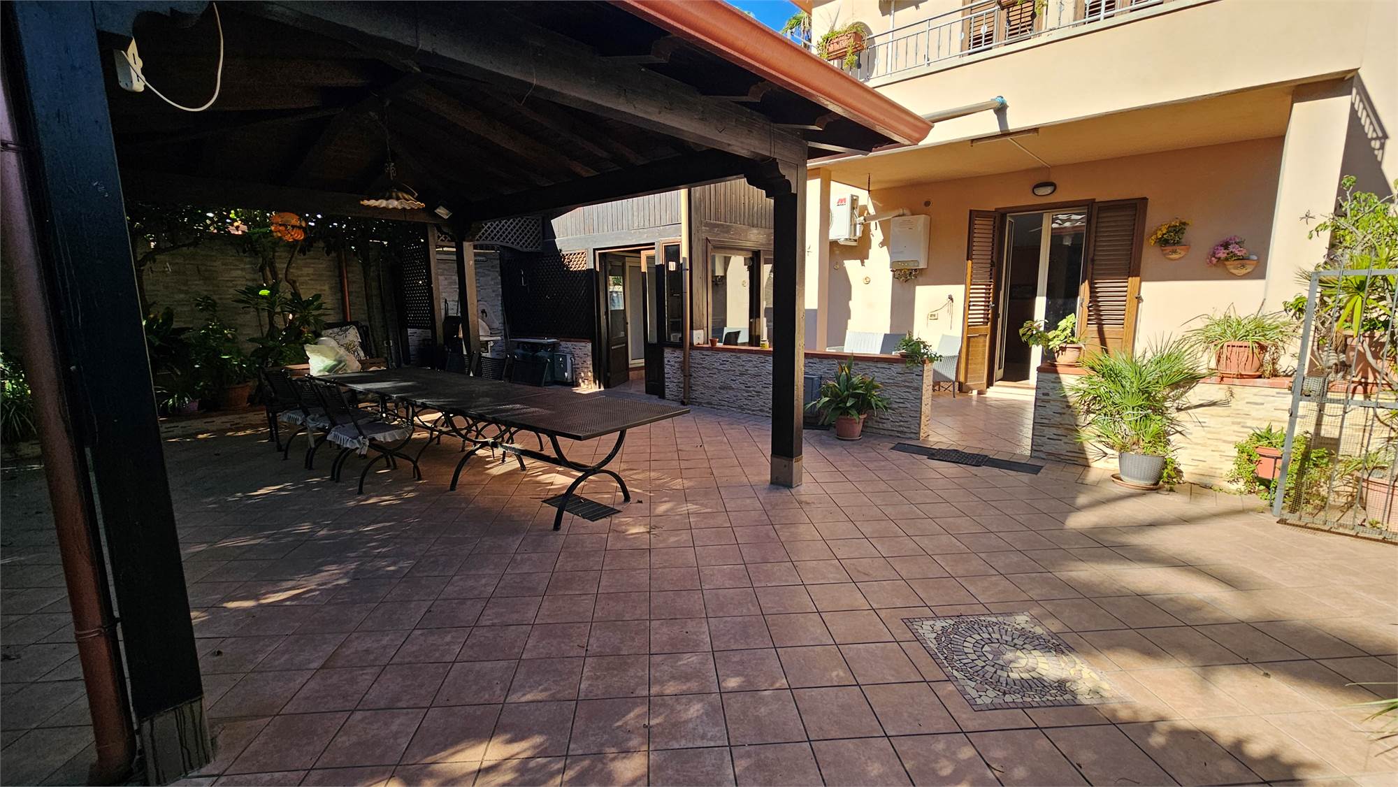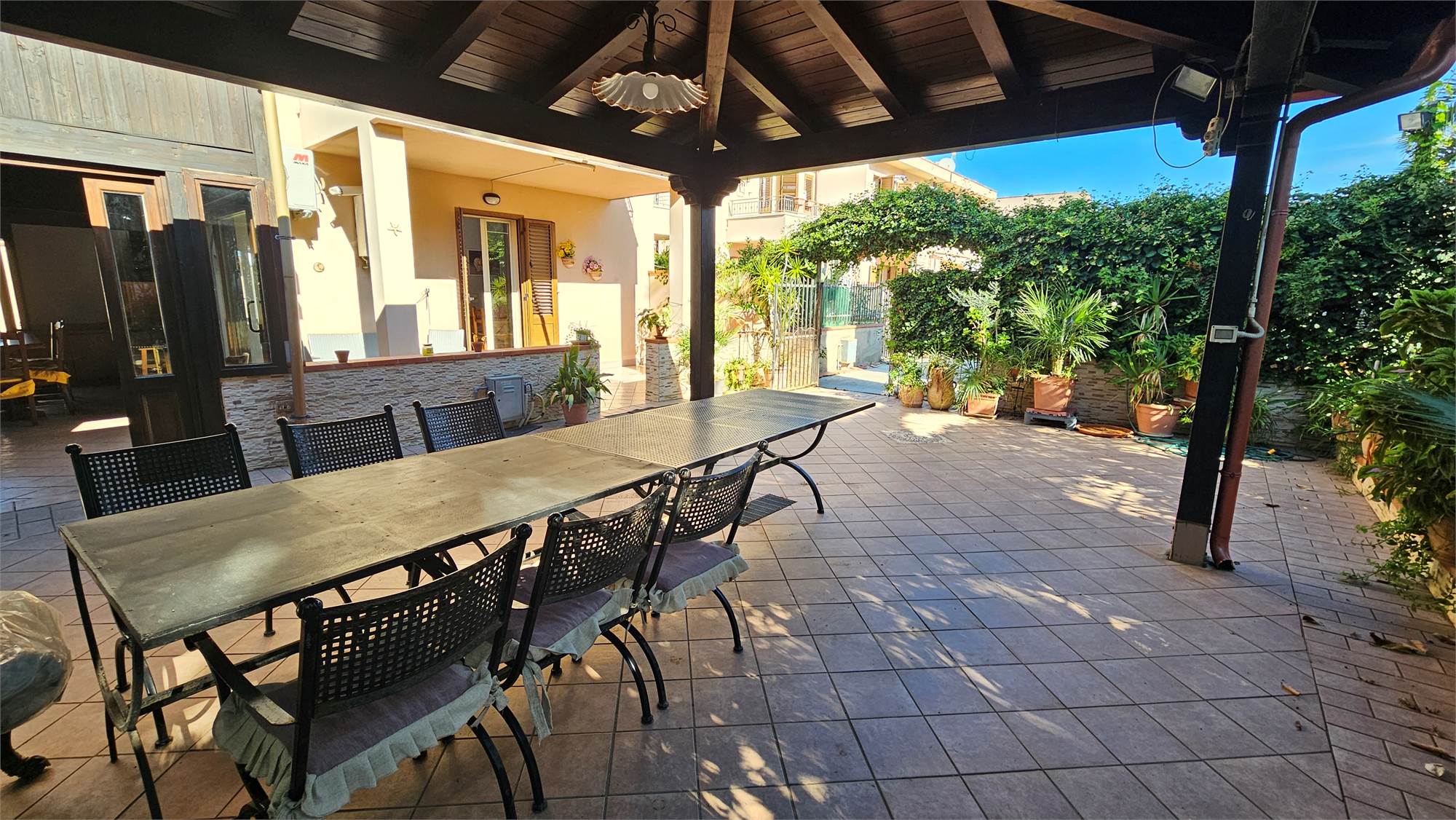 Al piano terra dell’abitazione principale si trova una luminosa zona living e cucina abitabile , bagno e porticato coperto affacciato su un curato spazio esterno pavimentato, circondato dal verde e dotato di una struttura con tetto in tegole, ideale come area relax o pranzo all’aperto.
