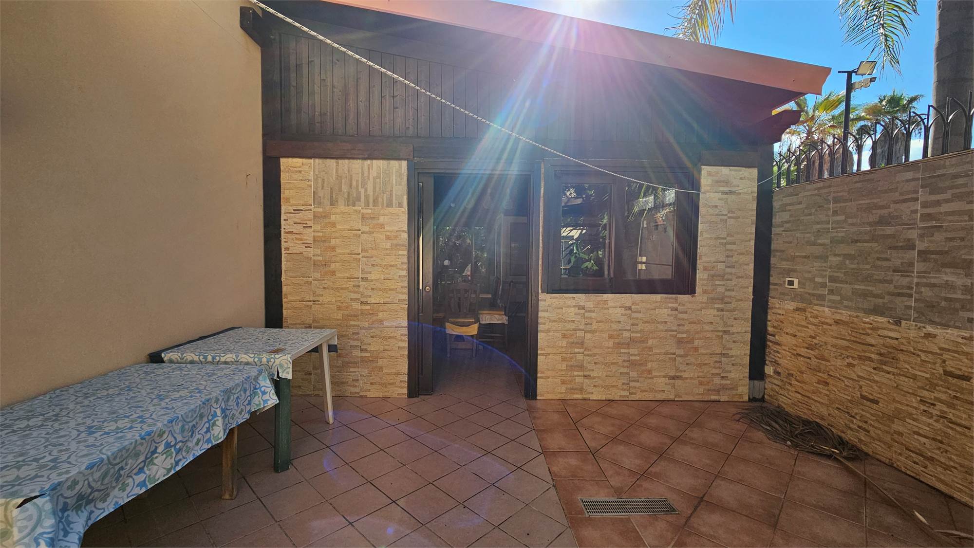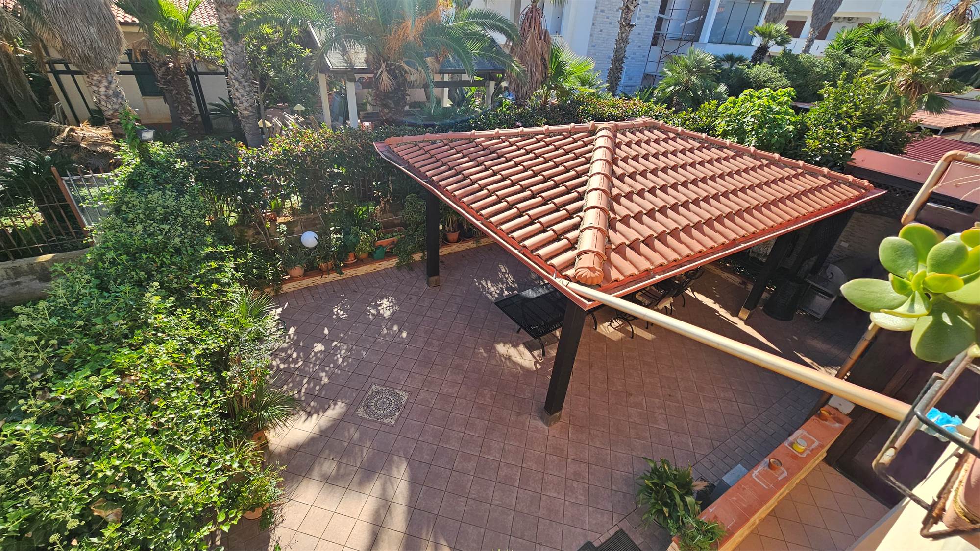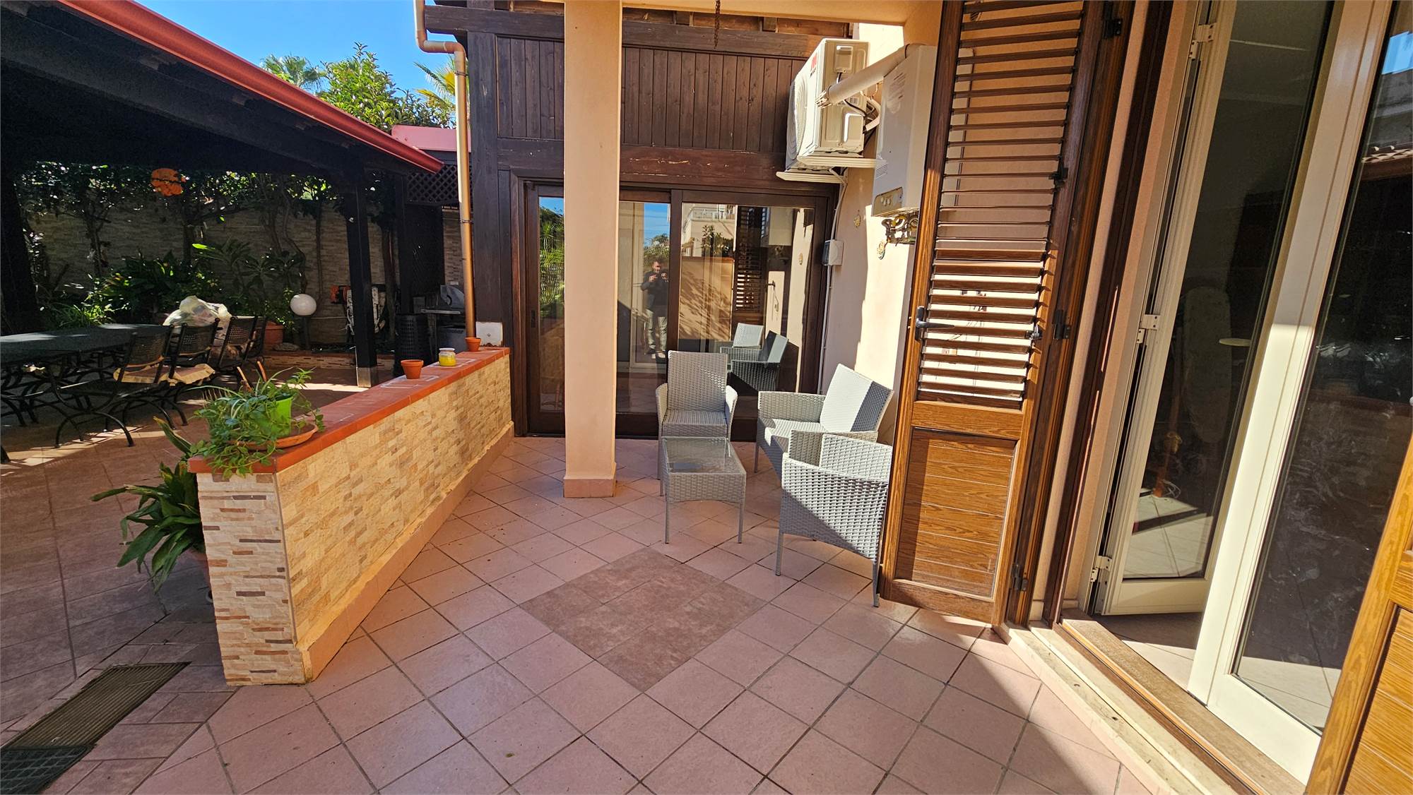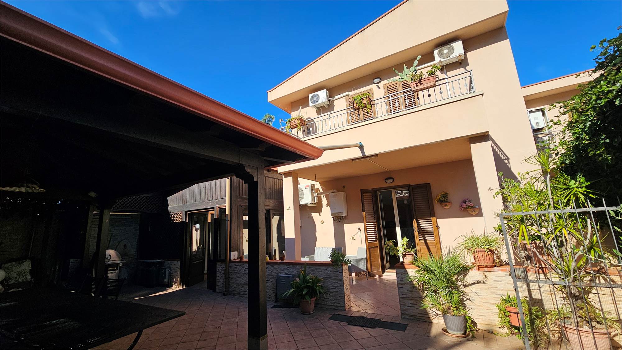 Al piano terra dell’abitazione principale si trova una luminosa zona living e cucina abitabile , bagno e porticato coperto affacciato su un curato spazio esterno pavimentato, circondato dal verde e dotato di una struttura con tetto in tegole, ideale come area relax o pranzo all’aperto.
