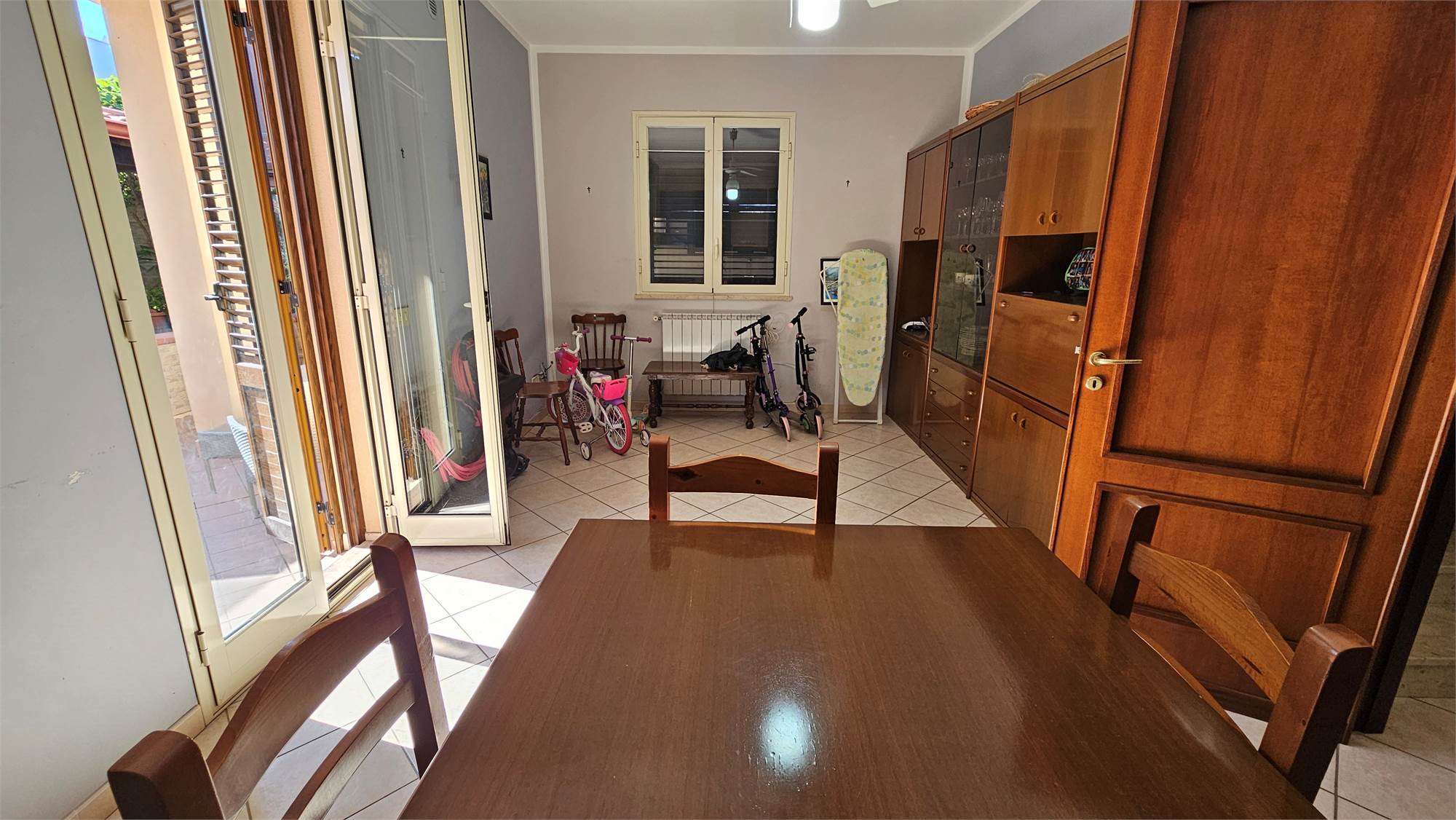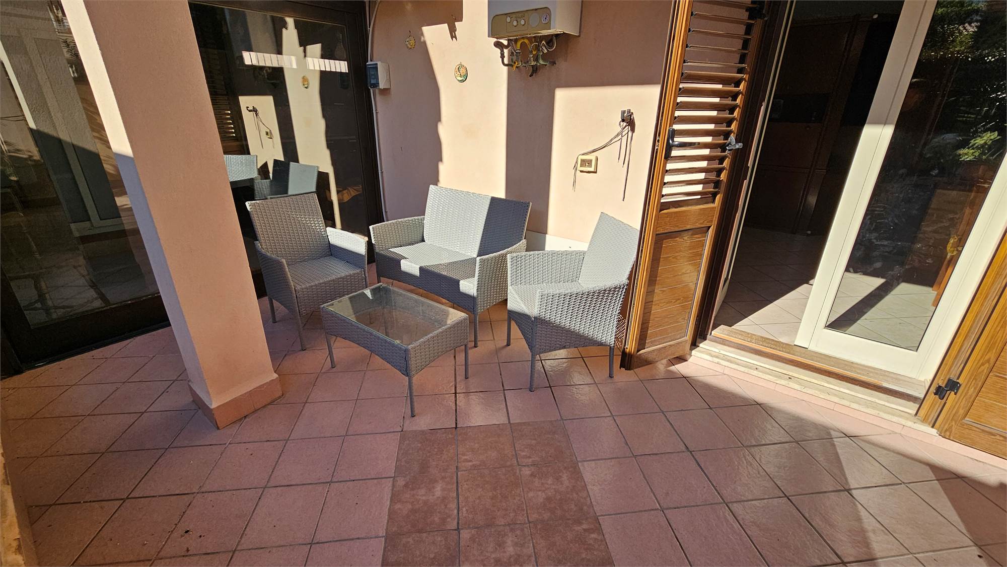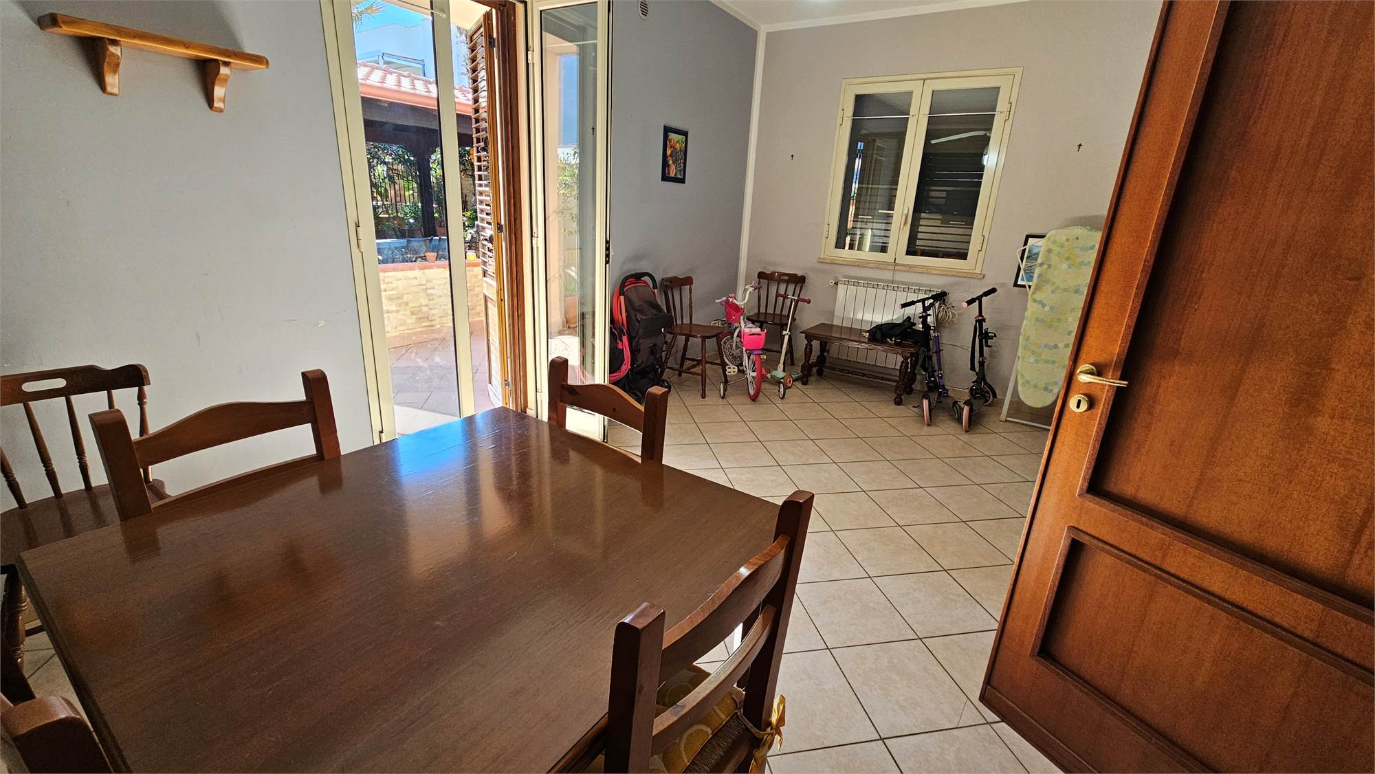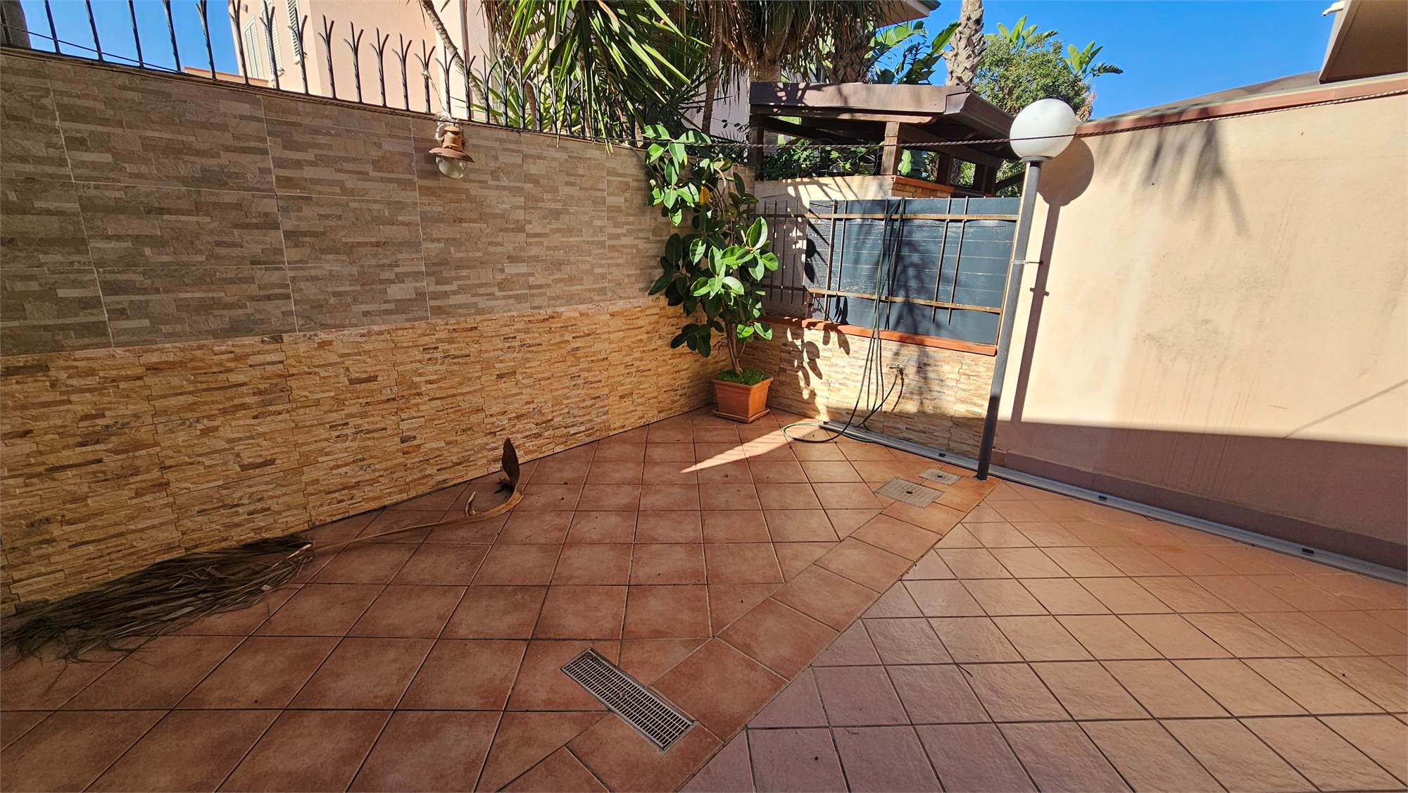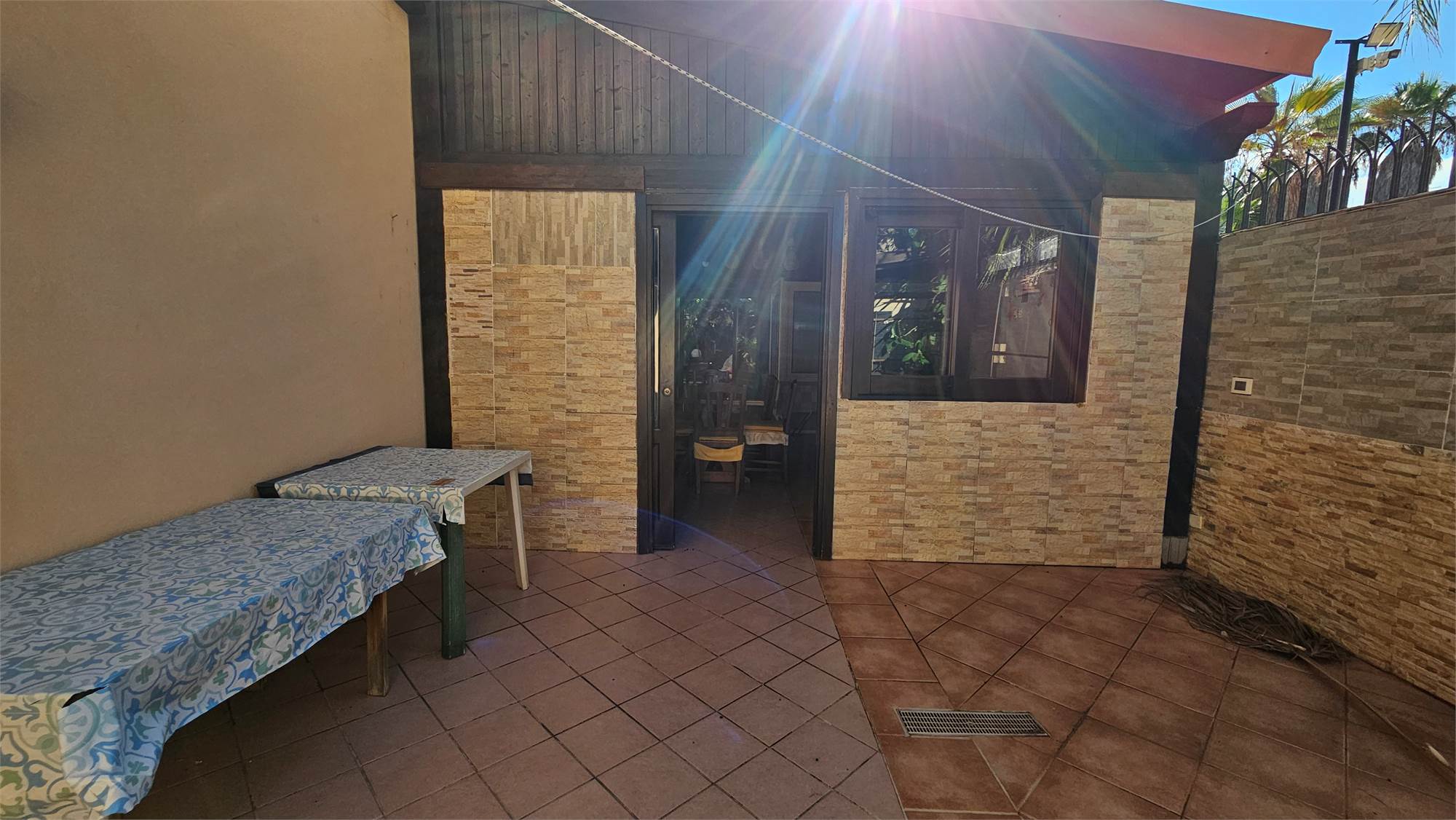 Al piano terra dell’abitazione principale si trova una luminosa zona living e cucina abitabile , bagno e porticato coperto affacciato su un curato spazio esterno pavimentato, circondato dal verde e dotato di una struttura con tetto in tegole, ideale come area relax o pranzo all’aperto.