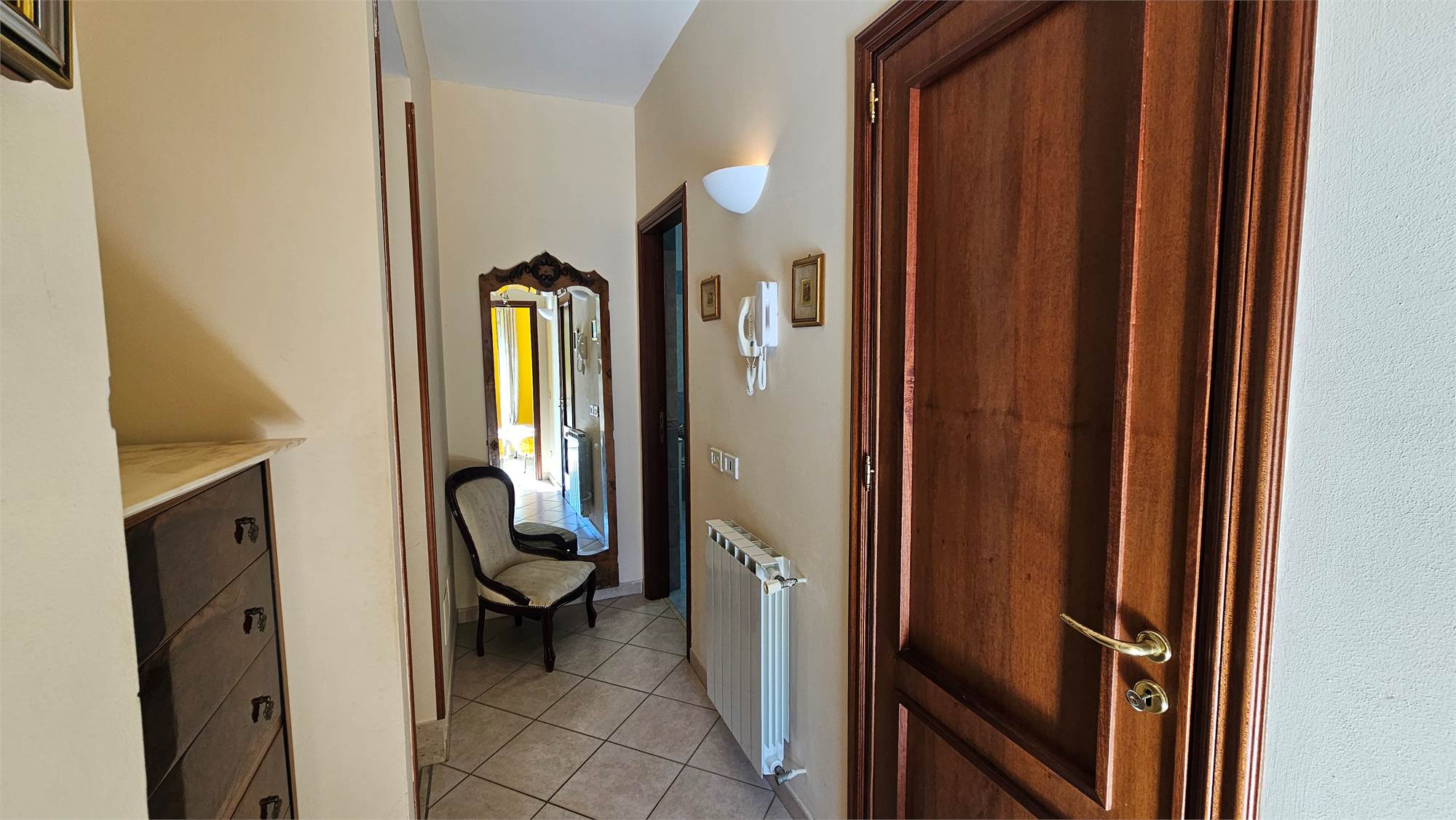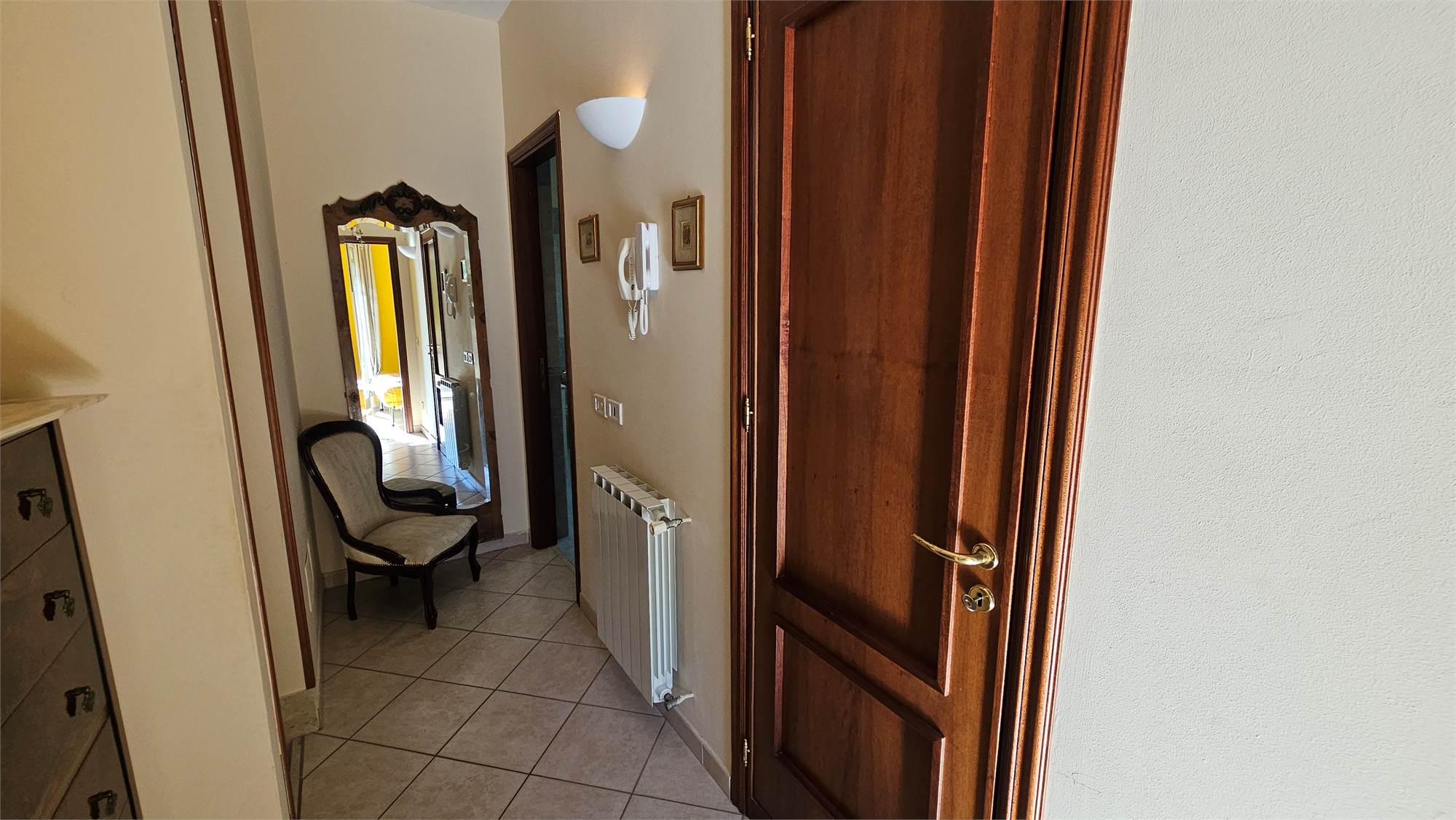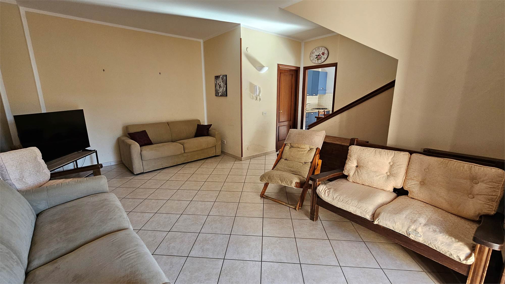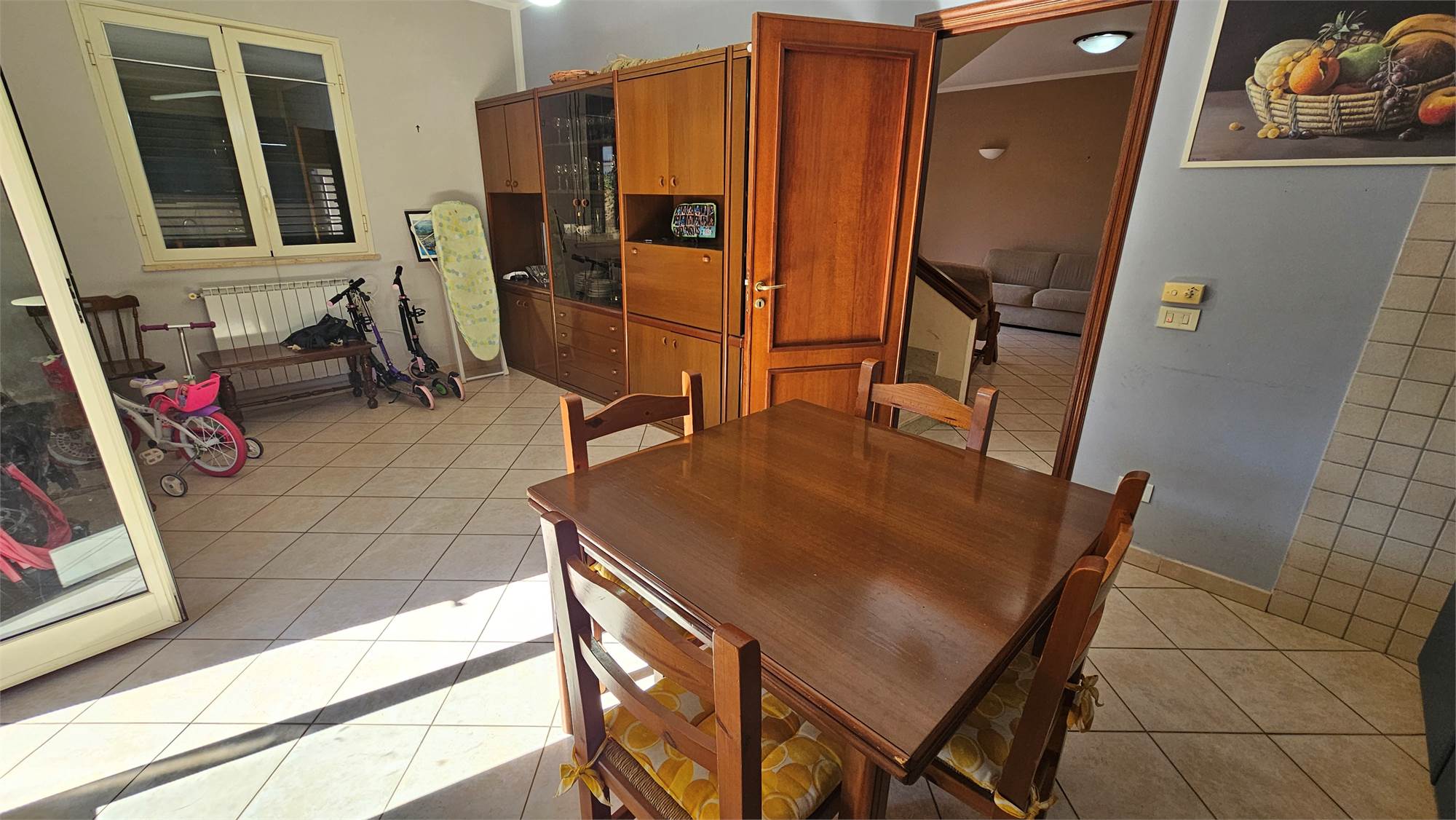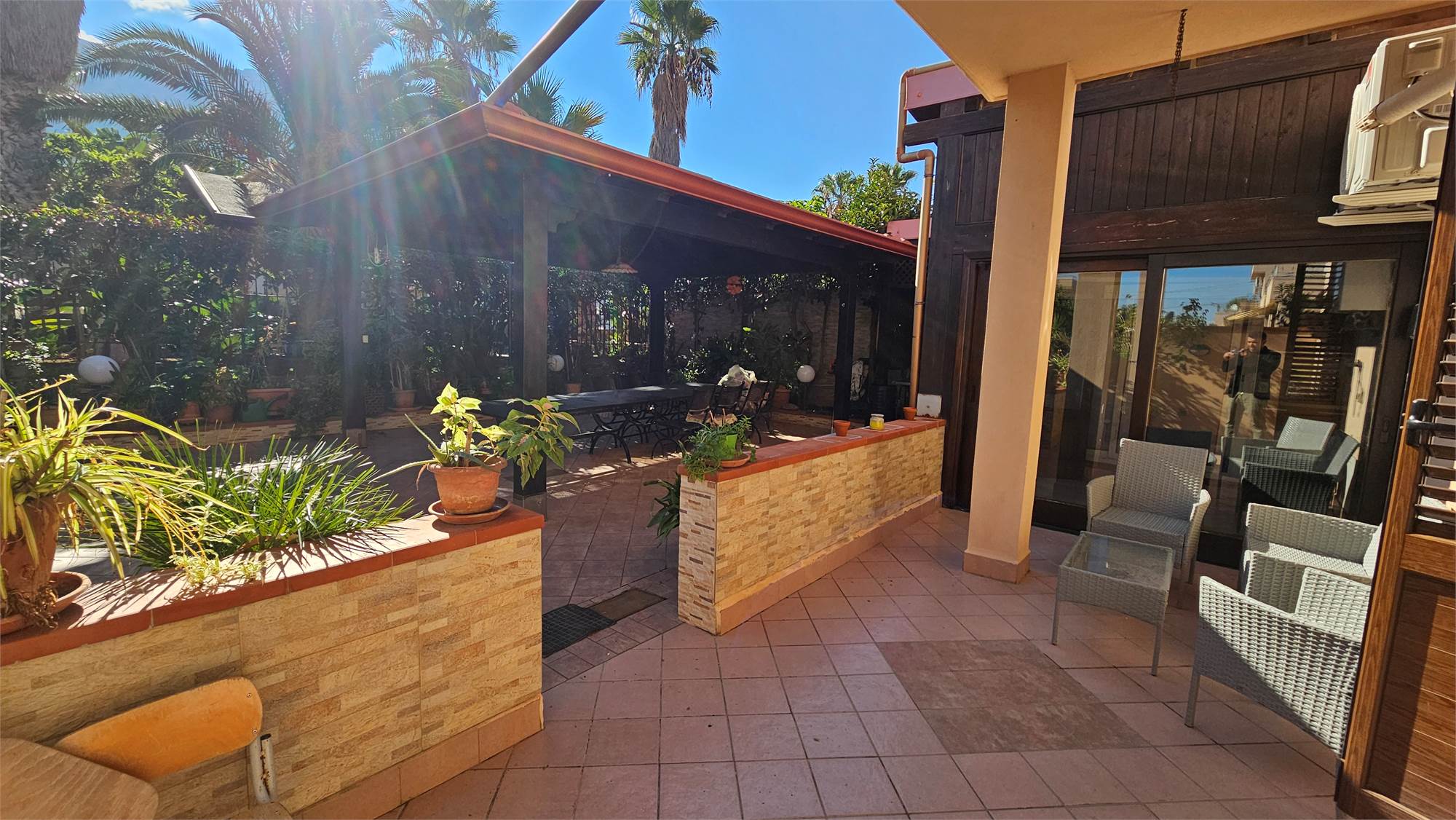 Al piano terra dell’abitazione principale si trova una luminosa zona living e cucina abitabile , bagno e porticato coperto affacciato su un curato spazio esterno pavimentato, circondato dal verde e dotato di una struttura con tetto in tegole, ideale come area relax o pranzo all’aperto.